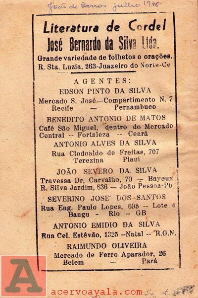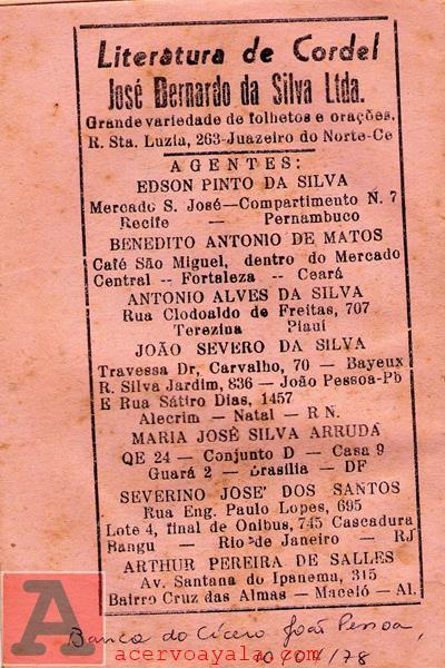 21.História de João da Cruz. João Martins de Athayde. Ed. Prop. José Bernardo da Silva – Juazeiro do Norte – CE – s.d. – 48.